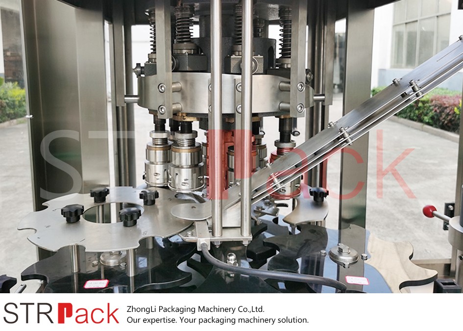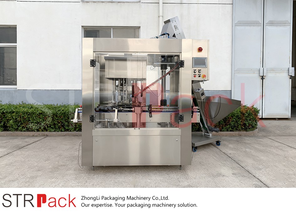 This rotary capping machine handles up to 120 bottles per minute, with a maximum of 200 BPM under optimal conditions. It features precise container handling, a touchscreen storing up to 99 programmable recipes, and adaptable capping chucks for various closure types. Controlled by a PLC system, the machine automatically picks up a bottle cap, grips it, and applies torque to tighten it onto the bottle.